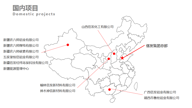 信发集团新疆公司于2009年6月动工建设,累计投资400余亿元人民币,建成了4×36万热电机组、2×110万热电机组,总装机容量364万;年产能190万吨电解铝生产线;年产能80万吨铝用预焙阳极生产线;180万吨/年铝铸造深加工生产线;现代农业;新能源及42公里铁路运输系统等。公司生产设备及工艺国际国内领先,自动化程度高,公司目前员工4500余人。