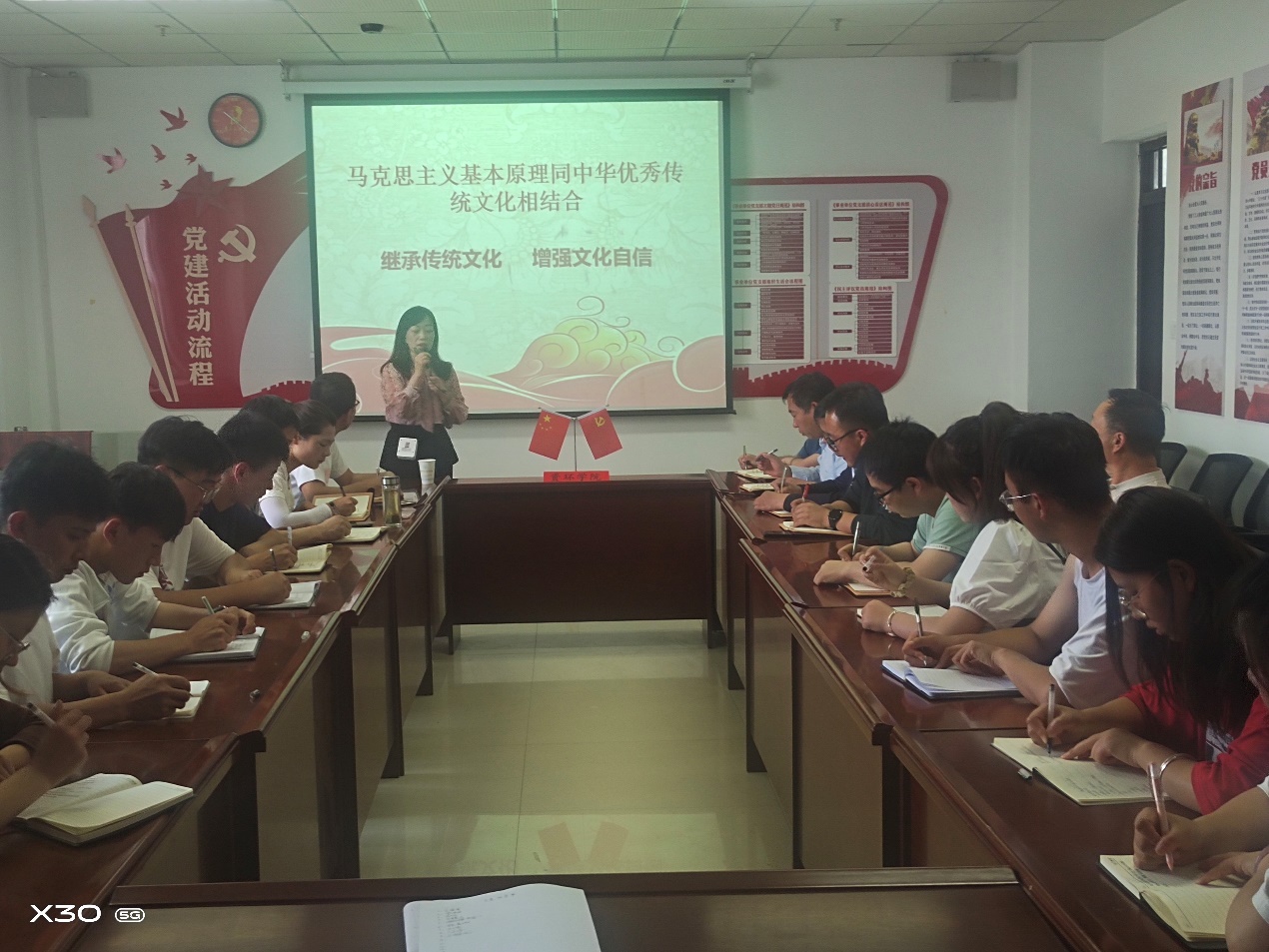 为进一步继承和弘扬中国优秀传统文化,增强文化自信,为今后的工作和学习提供坚实的精神基础,6月13日,在公司马克思主义公司楚艳平教授的带领下,公司党总支全体党员在新区校区公司党员活动室开展了“继承传统文化、增强文化自信”主题党日活动。