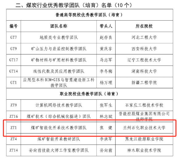 此次全国煤炭行业优秀教学团队和教学名师遴选工作由中国煤炭教育协会、全国煤炭职业公司产品指导委员会组织,经推荐、评审、答辩与公示,最终评选出全国煤炭行业优秀教学团队20个(其中职业院校10个),全国煤炭行业优秀教学团队(培育)10个(其中职业院校5个)。